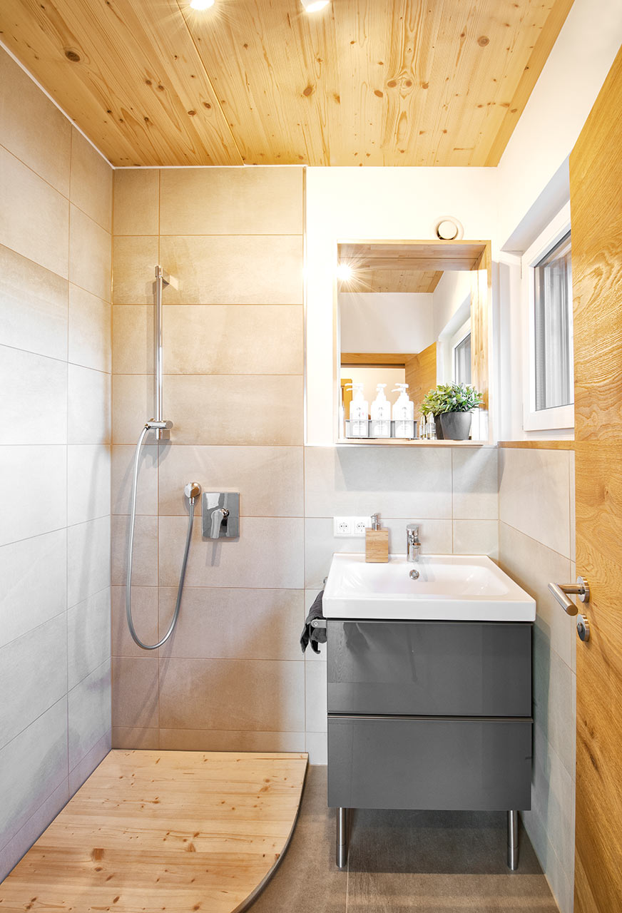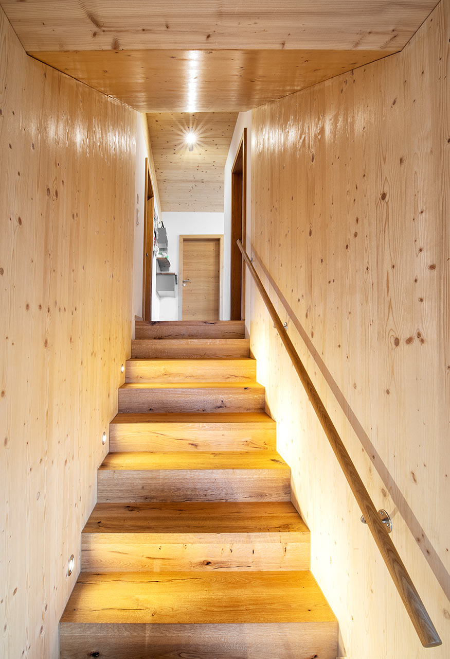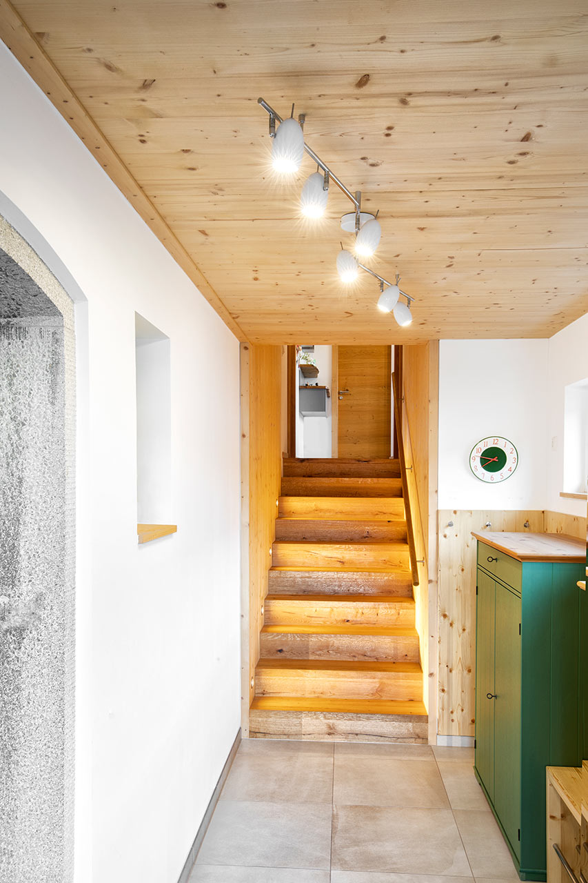 Eine Treppe führt im neu gestalteten Eingangsbereich hinauf in die Physiopraxis, die an das Bestandsgebäude aus den 50er Jahren als Kubus angebaut wurde. Von außen zeigt sich diese Schräge durch polygonal angeordnete Plattenelemente. Innen sorgen Dielen und Türen aus Eiche, große Fensterflächen und Massivholzdecken für eine angenehme Atmosphäre. Der Clou der Schräge: durch das Aufständern entstand darunter (ebenerdig) ein großer lichtdurchfluteter Abstellraum für Räder, Gartengeräte etc.