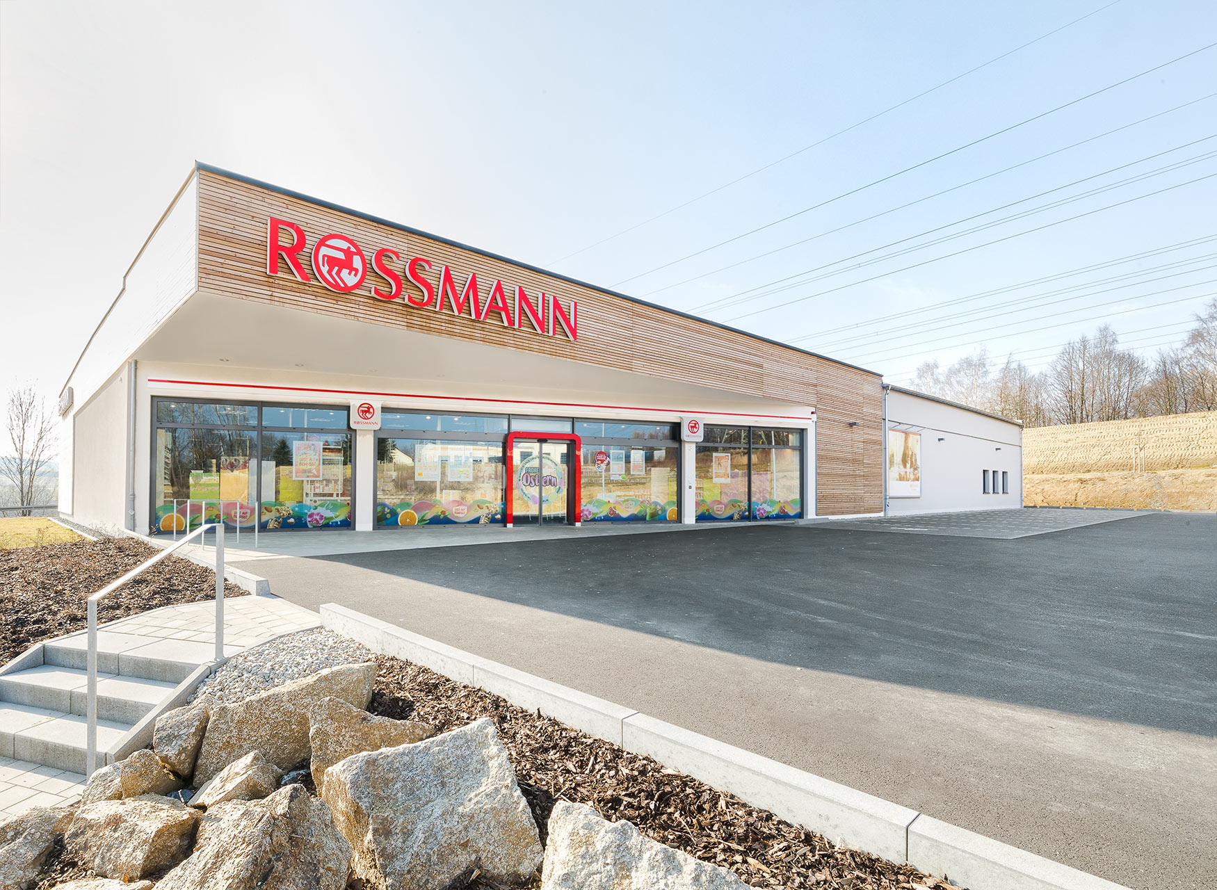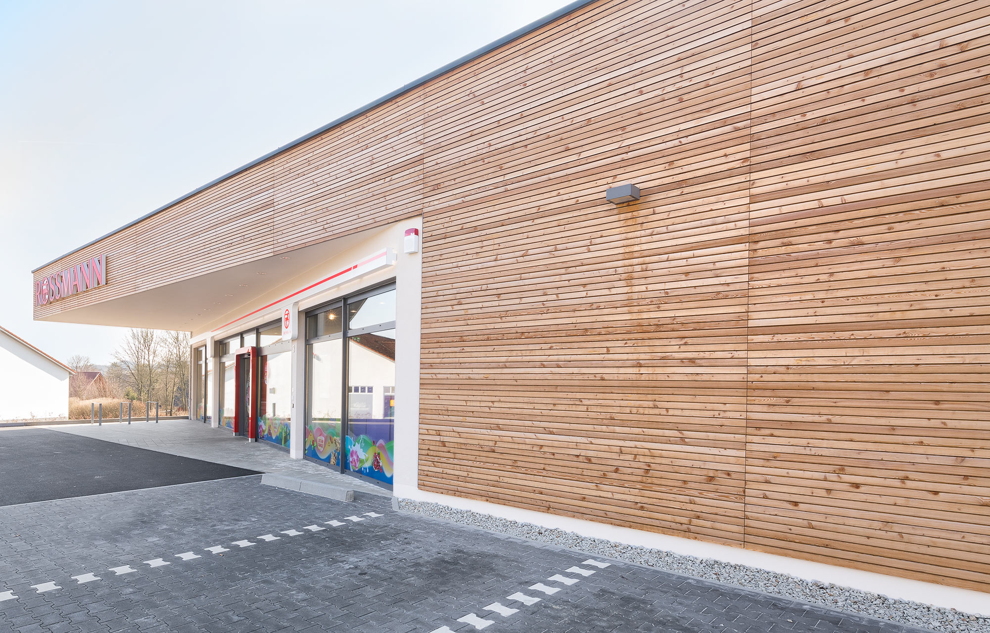 Der neue Rossmann in Windischeschenbach ist fertig. Die großflächige Lärchenrhombus-Verkleidung betont das einheitliche Design der neuen Märkte. Besonderes Merkmal ist der schrägverlaufende Dachüberstand im Eingangsbereich, der eine Dynamik in der Erscheinung erzeugt.