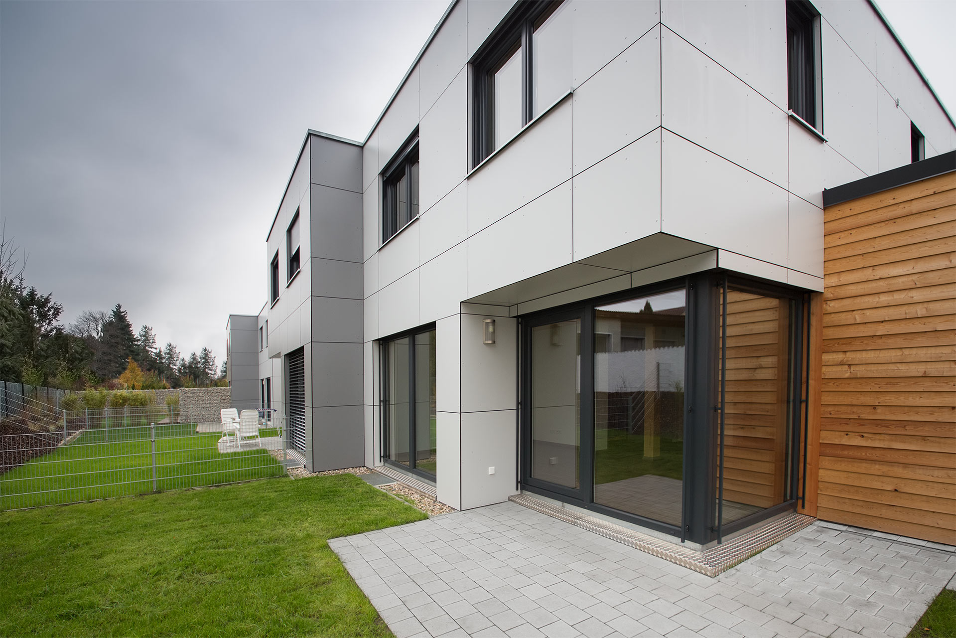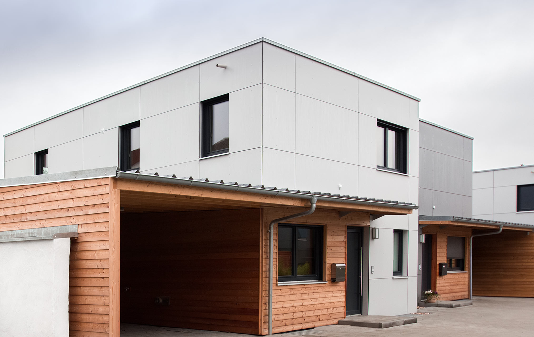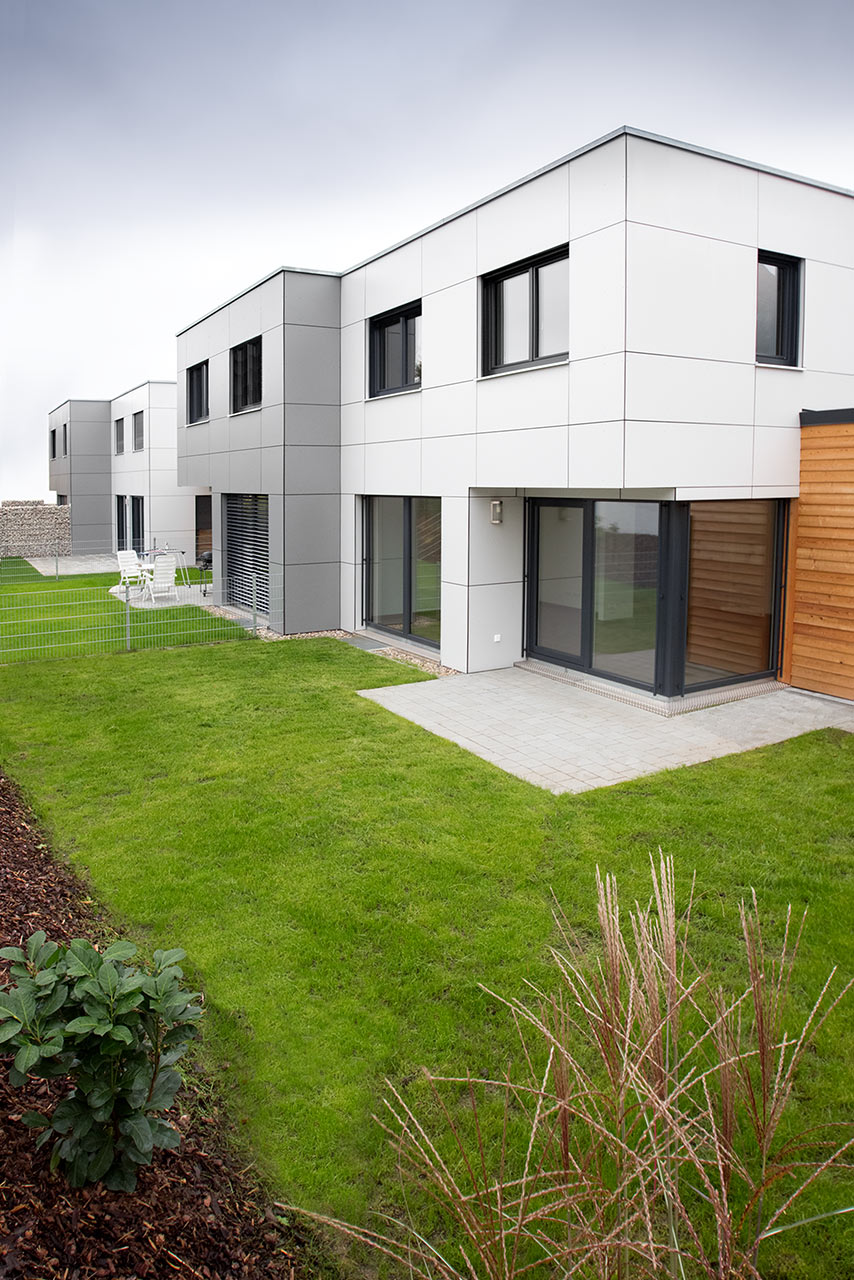Die acht Doppelhaushälften sind Niedrigenergiehäuser (Energieeffizienz: KfW 55) in hochgedämmter Holzständerbauweise (Holzständer ausgeflockt mit Zellulose). Die Senova-Plattenverkleidung als hinterlüftete Fassade bietet einerseits dauerhaften Wetterschutz ohne weitere Pflegemaßnahmen, andererseits sommerlichen Wärmeschutz: Die Hitze steigt durch die Thermik hinter den Platten in der hinterlüfteten Ebene nach oben und entweicht an der Attika, wodurch sich die Wand nicht erwärmen kann. Die im Keller innen aufgestellte Luft-Wärmepumpe für Fußbodenheizung und Trinkwasser kann außerdem an die Photovoltaikanlage gekoppelt werden. Abgerundet wird das Konzept durch die Lüftungsanlage mit Wärmerückgewinnung. Mittels der verschiedenen Grautöne erhält jedes Haus eine eigene „Adresse“, durch die der Hauseigentümer eine zusätzliche Identifikation erfährt. Die zwei Reihen mit je vier Häusern werden über Privatwege erschlossen. Besonders schön: Im Süden schließt eine wunderbare Gartenanlage an, auf die die großen Fenster einen perfekten Blick freigeben.