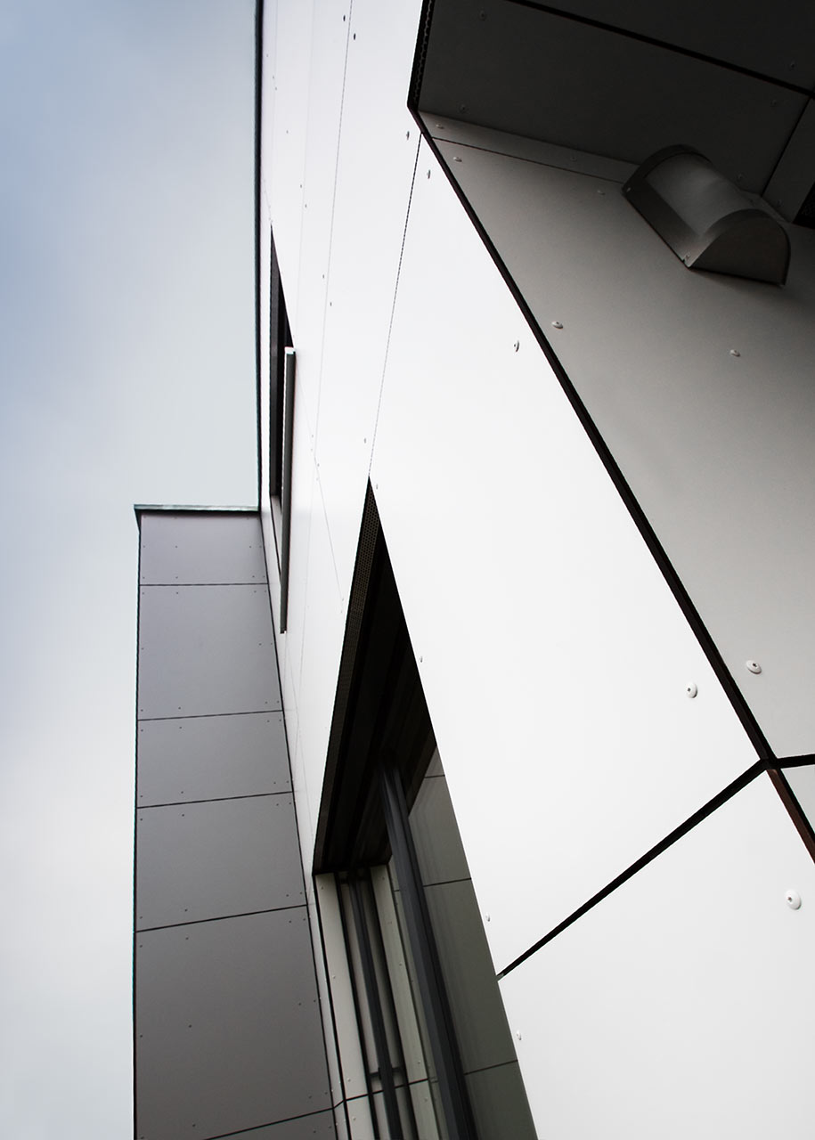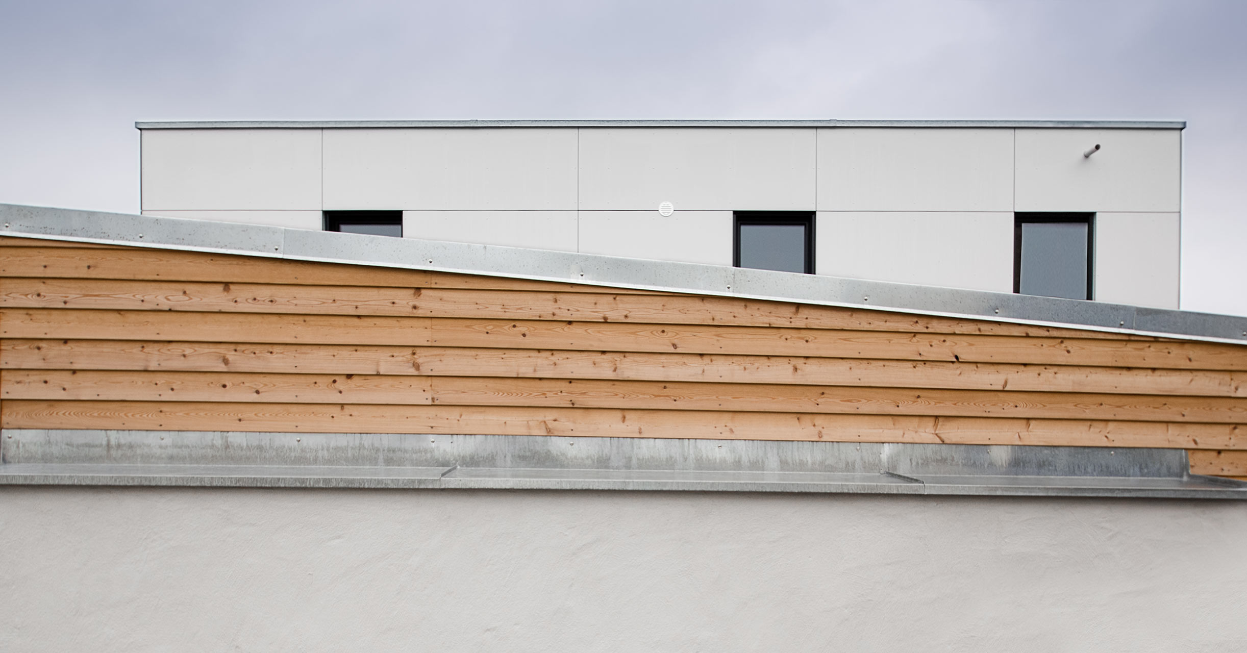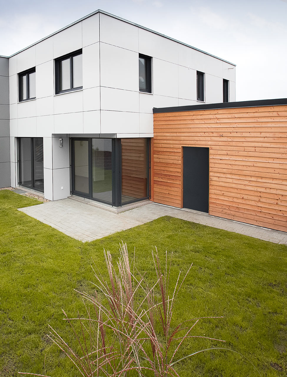 Die acht Doppelhaushälften sind Niedrigenergiehäuser (Energieeffizienz: KfW 55) in hochgedämmter Holzständerbauweise (Holzständer ausgeflockt mit Zellulose). Die Senova-Plattenverkleidung als hinterlüftete Fassade bietet einerseits dauerhaften Wetterschutz ohne weitere Pflegemaßnahmen, andererseits sommerlichen Wärmeschutz: Die Hitze steigt durch die Thermik hinter den Platten in der hinterlüfteten Ebene nach oben und entweicht an der Attika, wodurch sich die Wand nicht erwärmen kann. Die im Keller innen aufgestellte Luft-Wärmepumpe für Fußbodenheizung und Trinkwasser kann außerdem an die Photovoltaikanlage gekoppelt werden. Abgerundet wird das Konzept durch die Lüftungsanlage mit Wärmerückgewinnung. Mittels der verschiedenen Grautöne erhält jedes Haus eine eigene „Adresse“, durch die der Hauseigentümer eine zusätzliche Identifikation erfährt. Die zwei Reihen mit je vier Häusern werden über Privatwege erschlossen. Besonders schön: Im Süden schließt eine wunderbare Gartenanlage an, auf die die großen Fenster einen perfekten Blick freigeben.