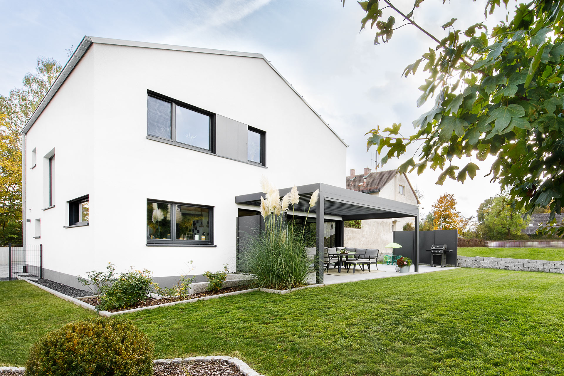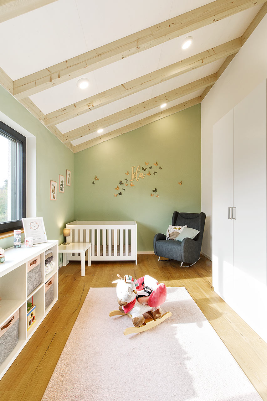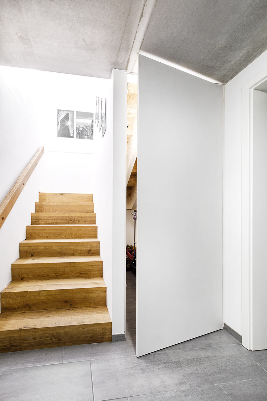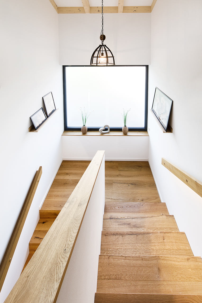 Eine zentrumsnahe Baulücke in einem gewachsenen Wohnviertel war Ausgangspunkt für dieses unterkellerte EFH mit flachem Satteldach. Um den zur Verfügung stehenden Platz optimal zu nutzen, werden klar definierte Zonen geschaffen. Wegachsen bilden die Verbindung und dienen zugleich als optische Struktur. Im UG finden u.a. Räume für Hobby und Arbeit Platz. Im Eingangsbereich des EG befindet sich ein großes Sitzfenster. Sehr dienlich, wenn es z.B. darum geht, bequem Schuhe anziehen zu können. Schrankfronten mit Stauraum wurden nahezu unsichtbar in den Fluren untergebracht. Kochen, Essen, Wohnen sind offen gestaltet, zum Garten und zur überdachten Terrasse ausgerichtet und werden durch eine Schiebetür vom Eingangsbereich separiert: bei Bedarf offen, oder eben geschlossen, wie es gerade am besten passt. Im OG befinden sich die beiden liebevoll gestalteten Kinderzimmer, das Bad sowie Schlafzimmer inkl. Ankleide. Licht, durch die große Fixverglasung kommend, durchflutet das Treppenhaus. Sichtbalken und stimmige Einrichtung erzeugen ein ruhiges Ambiente, das einen Hauch Industrial-Style versprüht.