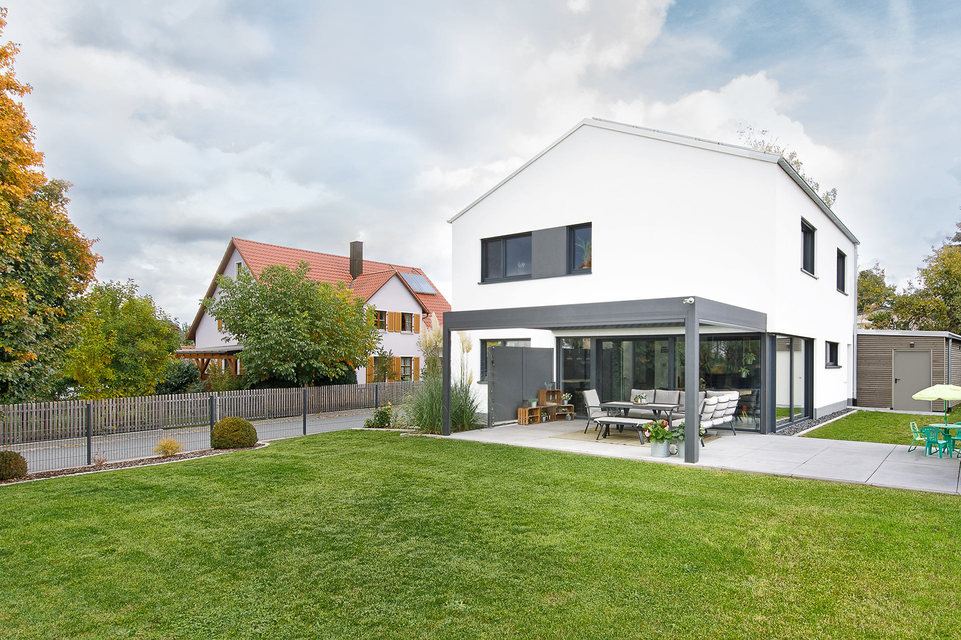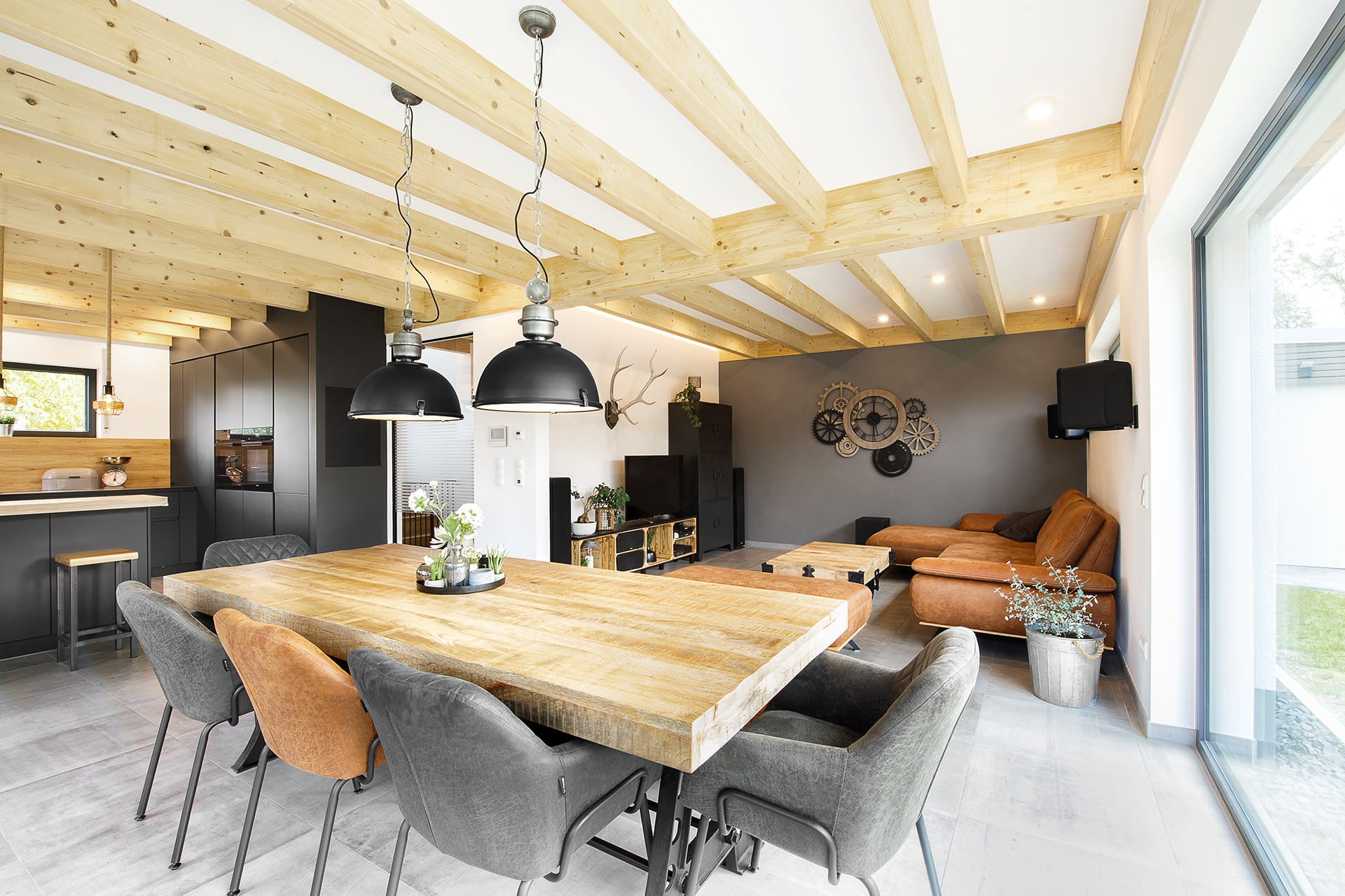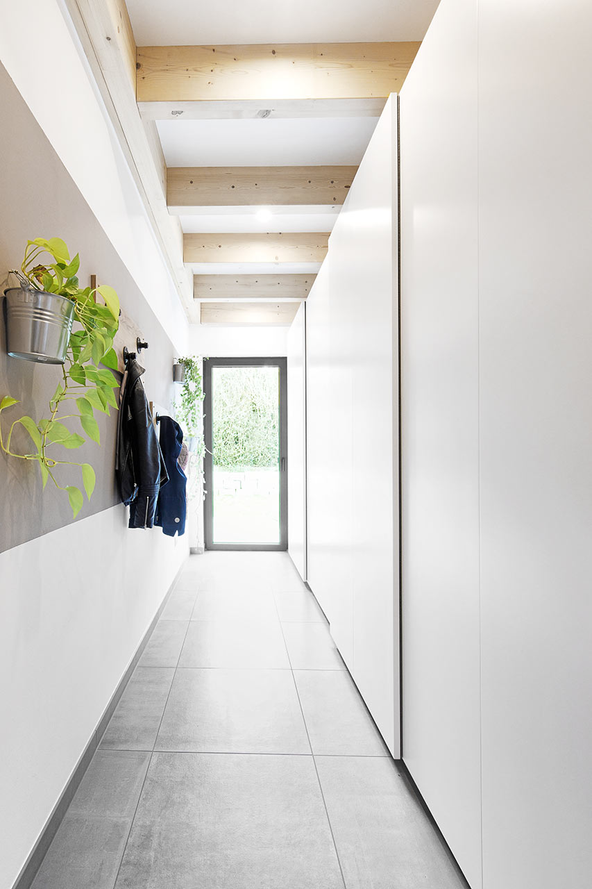 Eine zentrumsnahe Baulücke in einem gewachsenen Wohnviertel war Ausgangspunkt für dieses unterkellerte EFH mit flachem Satteldach. Um den zur Verfügung stehenden Platz optimal zu nutzen, werden klar definierte Zonen geschaffen. Wegachsen bilden die Verbindung und dienen zugleich als optische Struktur. Im UG finden u.a. Räume für Hobby und Arbeit Platz. Im Eingangsbereich des EG befindet sich ein großes Sitzfenster. Sehr dienlich, wenn es z.B. darum geht, bequem Schuhe anziehen zu können. Schrankfronten mit Stauraum wurden nahezu unsichtbar in den Fluren untergebracht. Kochen, Essen, Wohnen sind offen gestaltet, zum Garten und zur überdachten Terrasse ausgerichtet und werden durch eine Schiebetür vom Eingangsbereich separiert: bei Bedarf offen, oder eben geschlossen, wie es gerade am besten passt. Im OG befinden sich die beiden liebevoll gestalteten Kinderzimmer, das Bad sowie Schlafzimmer inkl. Ankleide. Licht, durch die große Fixverglasung kommend, durchflutet das Treppenhaus. Sichtbalken und stimmige Einrichtung erzeugen ein ruhiges Ambiente, das einen Hauch Industrial-Style versprüht.
