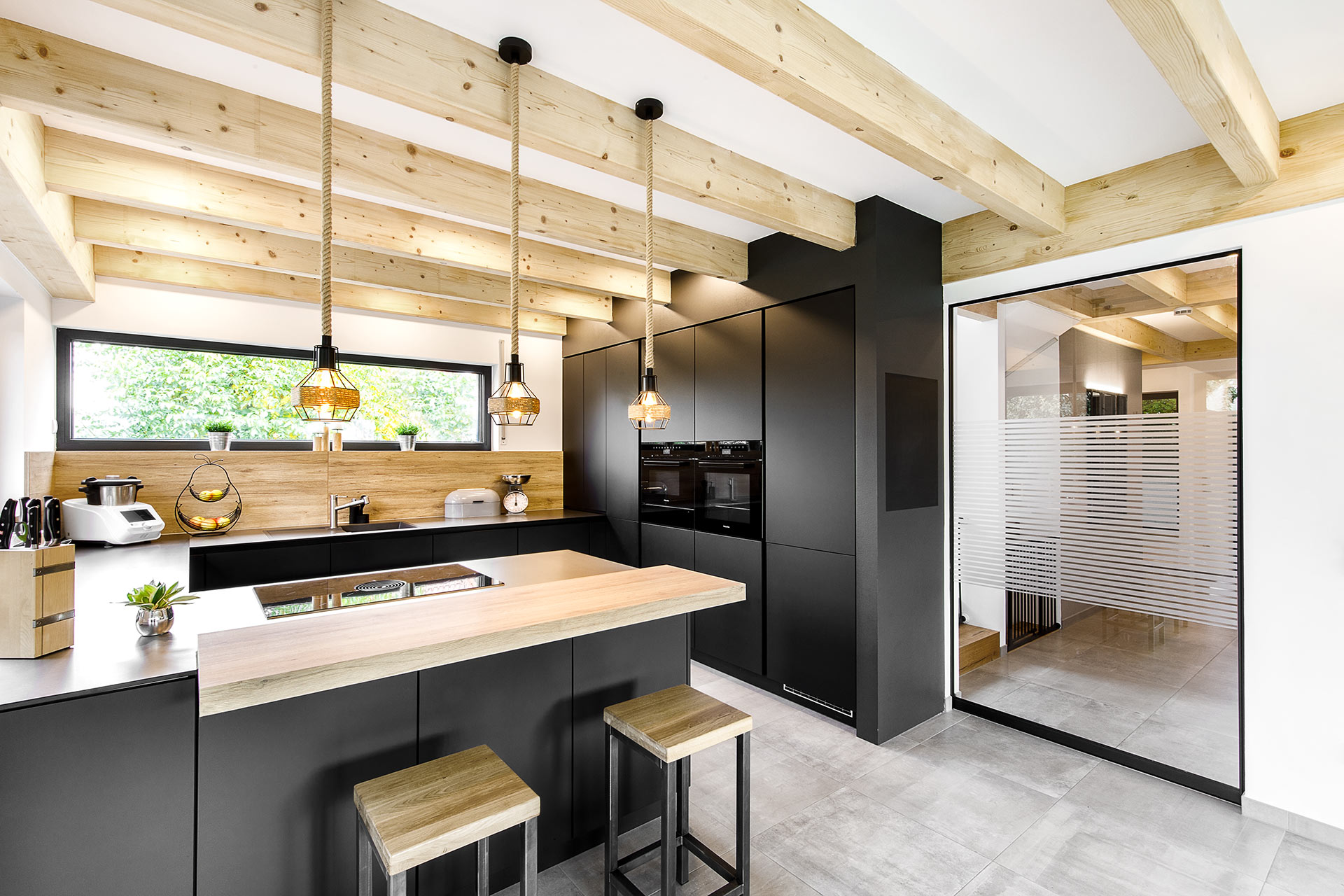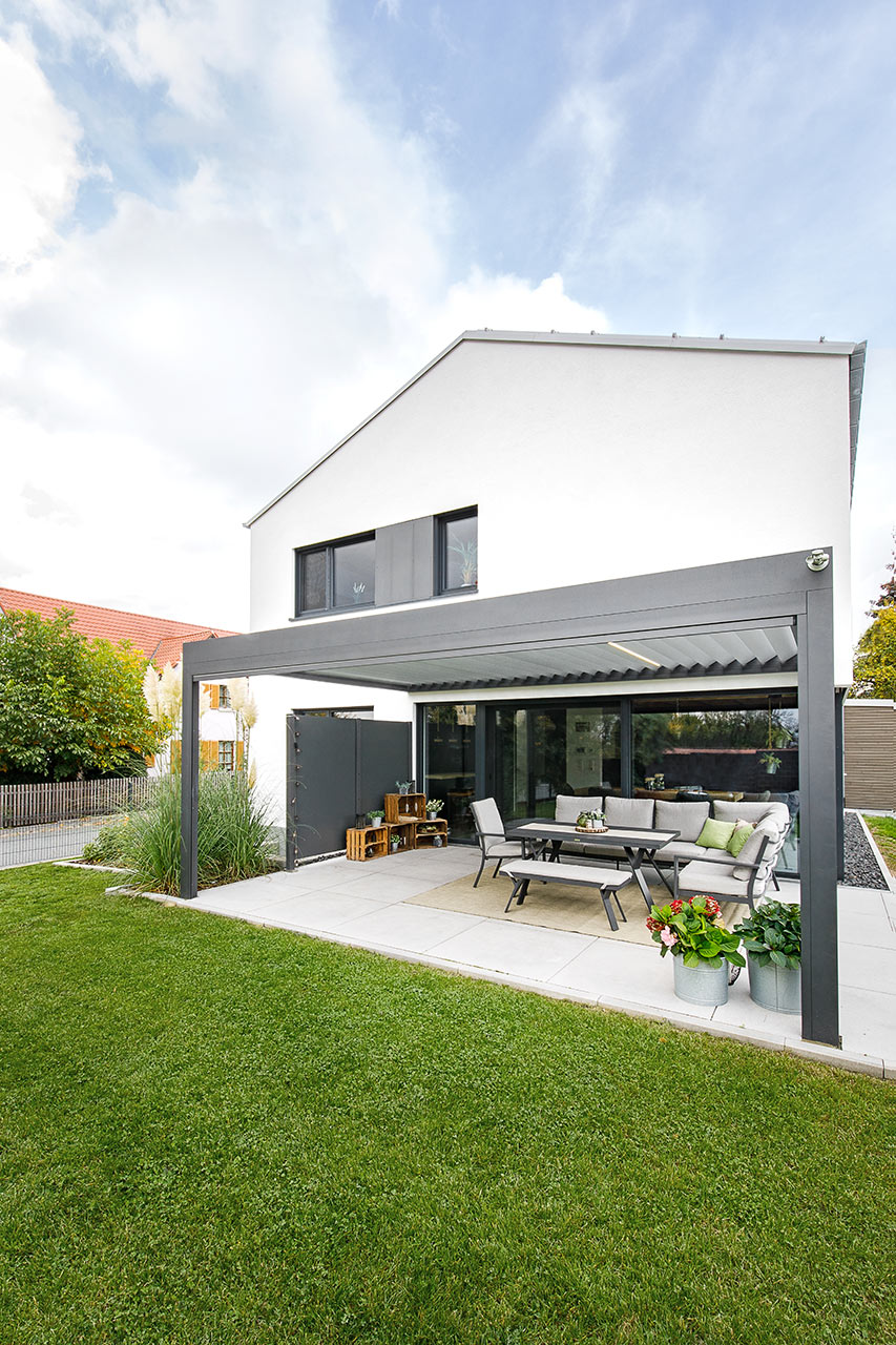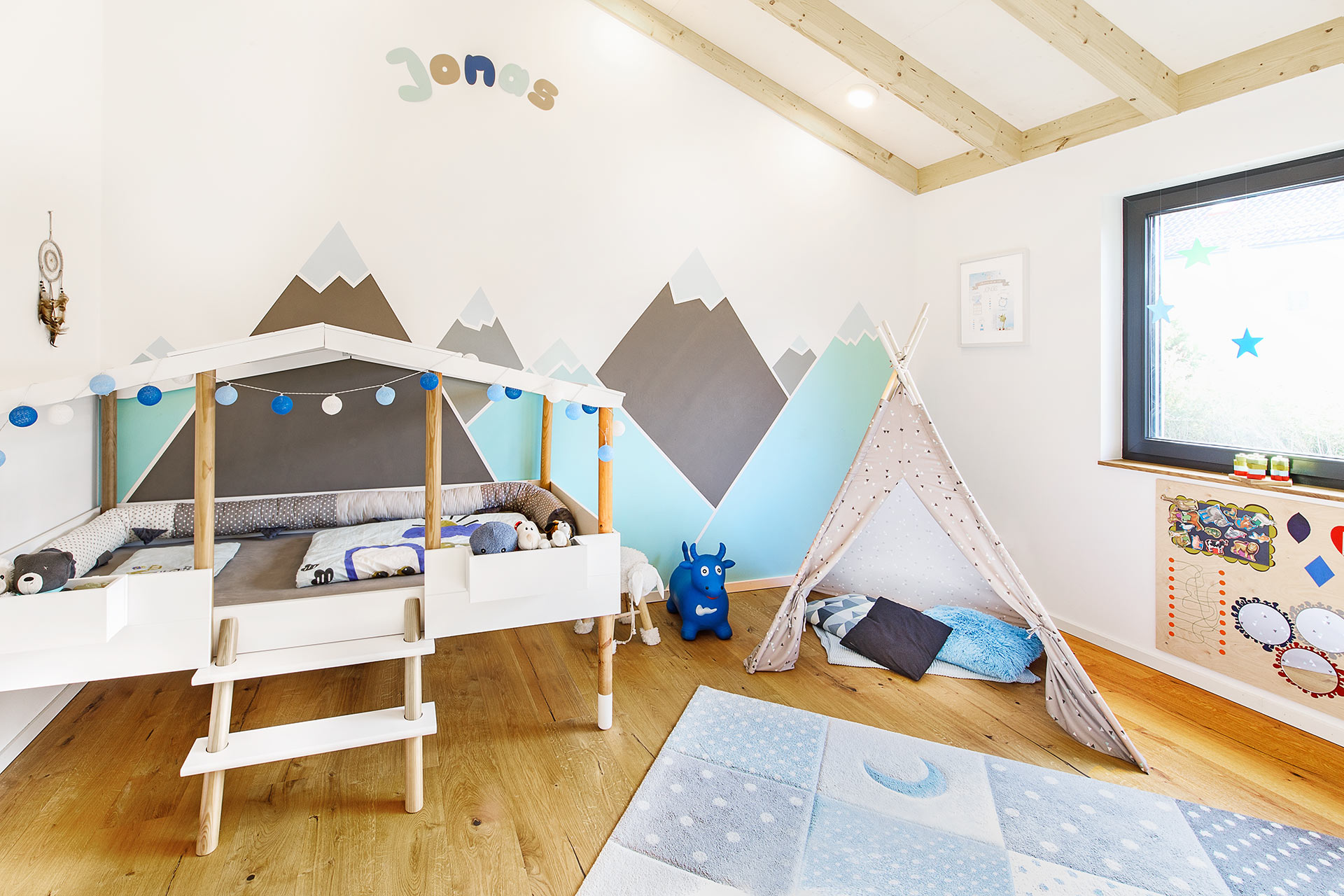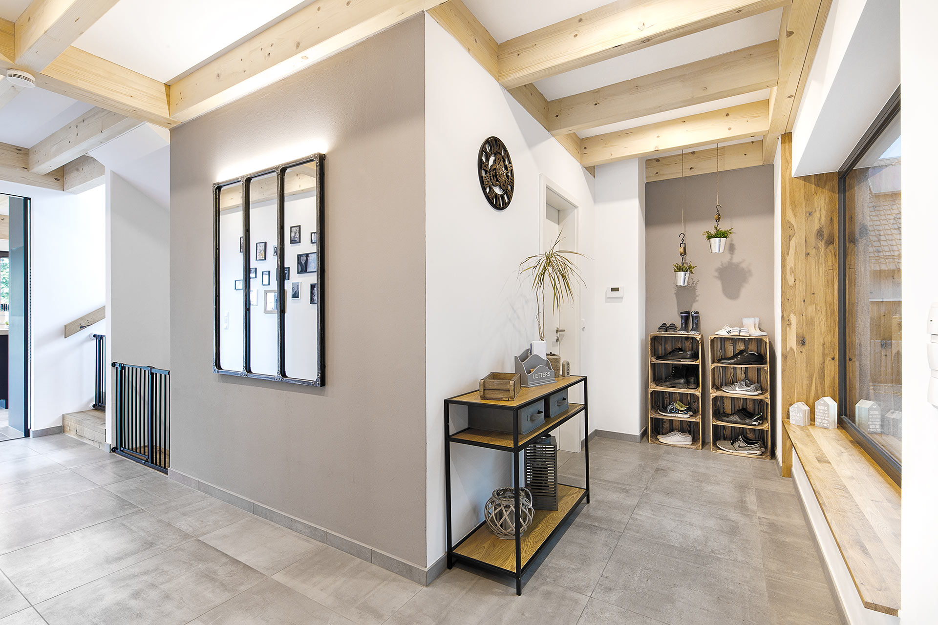 Eine zentrumsnahe Baulücke in einem gewachsenen Wohnviertel war Ausgangspunkt für dieses unterkellerte EFH mit flachem Satteldach. Um den zur Verfügung stehenden Platz optimal zu nutzen, werden klar definierte Zonen geschaffen. Wegachsen bilden die Verbindung und dienen zugleich als optische Struktur. Im UG finden u.a. Räume für Hobby und Arbeit Platz. Im Eingangsbereich des EG befindet sich ein großes Sitzfenster. Sehr dienlich, wenn es z.B. darum geht, bequem Schuhe anziehen zu können. Schrankfronten mit Stauraum wurden nahezu unsichtbar in den Fluren untergebracht. Kochen, Essen, Wohnen sind offen gestaltet, zum Garten und zur überdachten Terrasse ausgerichtet und werden durch eine Schiebetür vom Eingangsbereich separiert: bei Bedarf offen, oder eben geschlossen, wie es gerade am besten passt. Im OG befinden sich die beiden liebevoll gestalteten Kinderzimmer, das Bad sowie Schlafzimmer inkl. Ankleide. Licht, durch die große Fixverglasung kommend, durchflutet das Treppenhaus. Sichtbalken und stimmige Einrichtung erzeugen ein ruhiges Ambiente, das einen Hauch Industrial-Style versprüht.