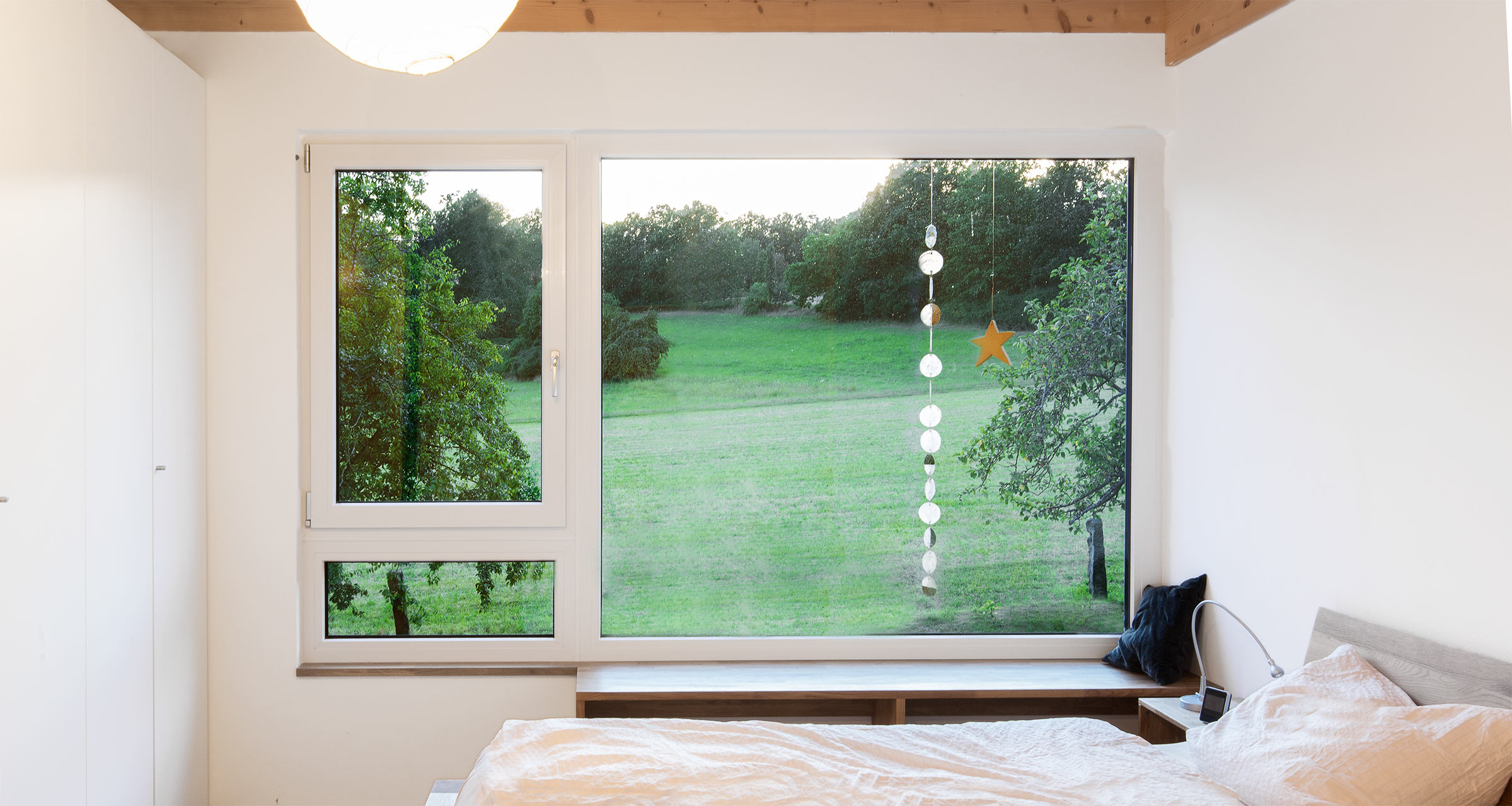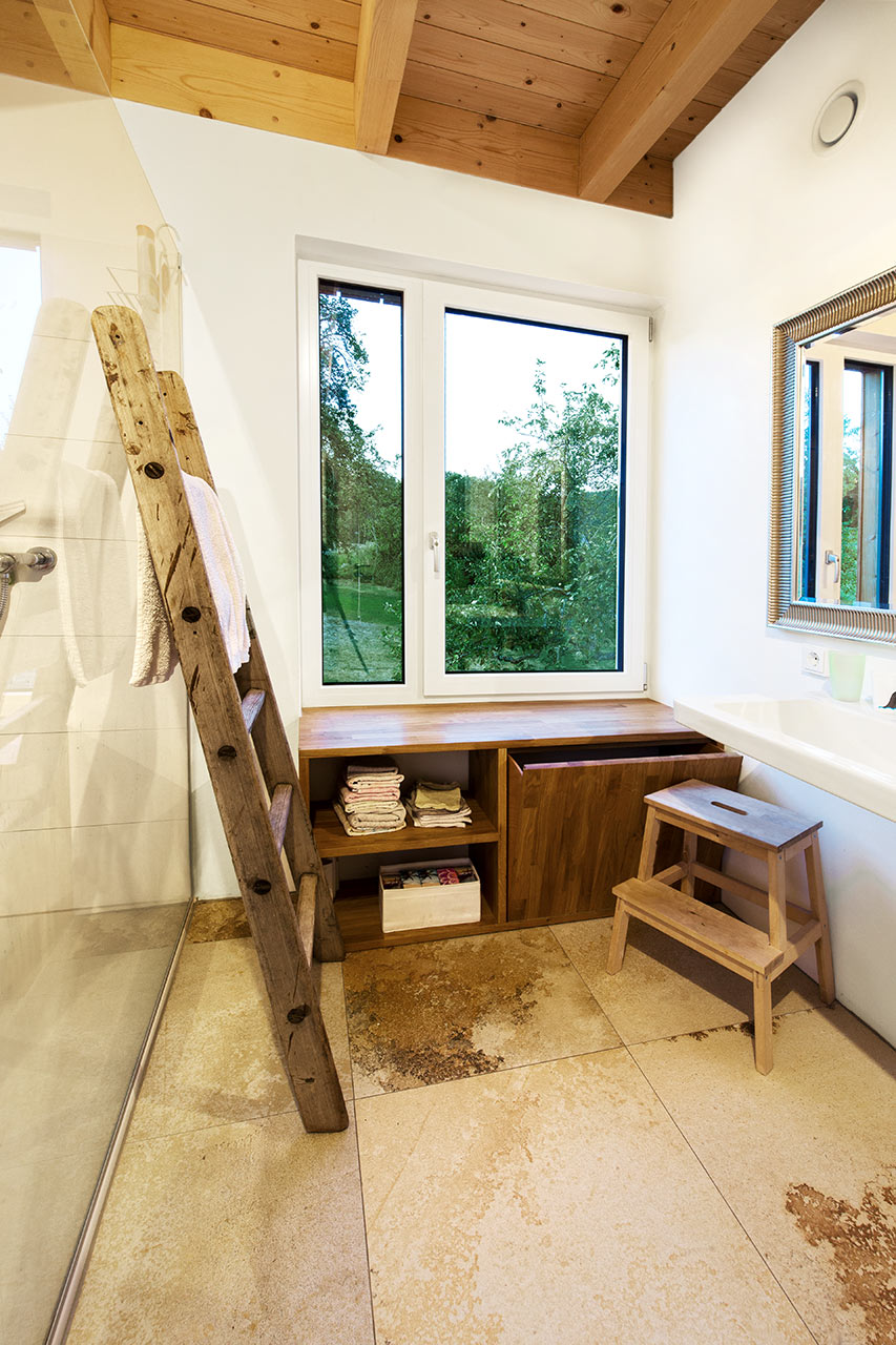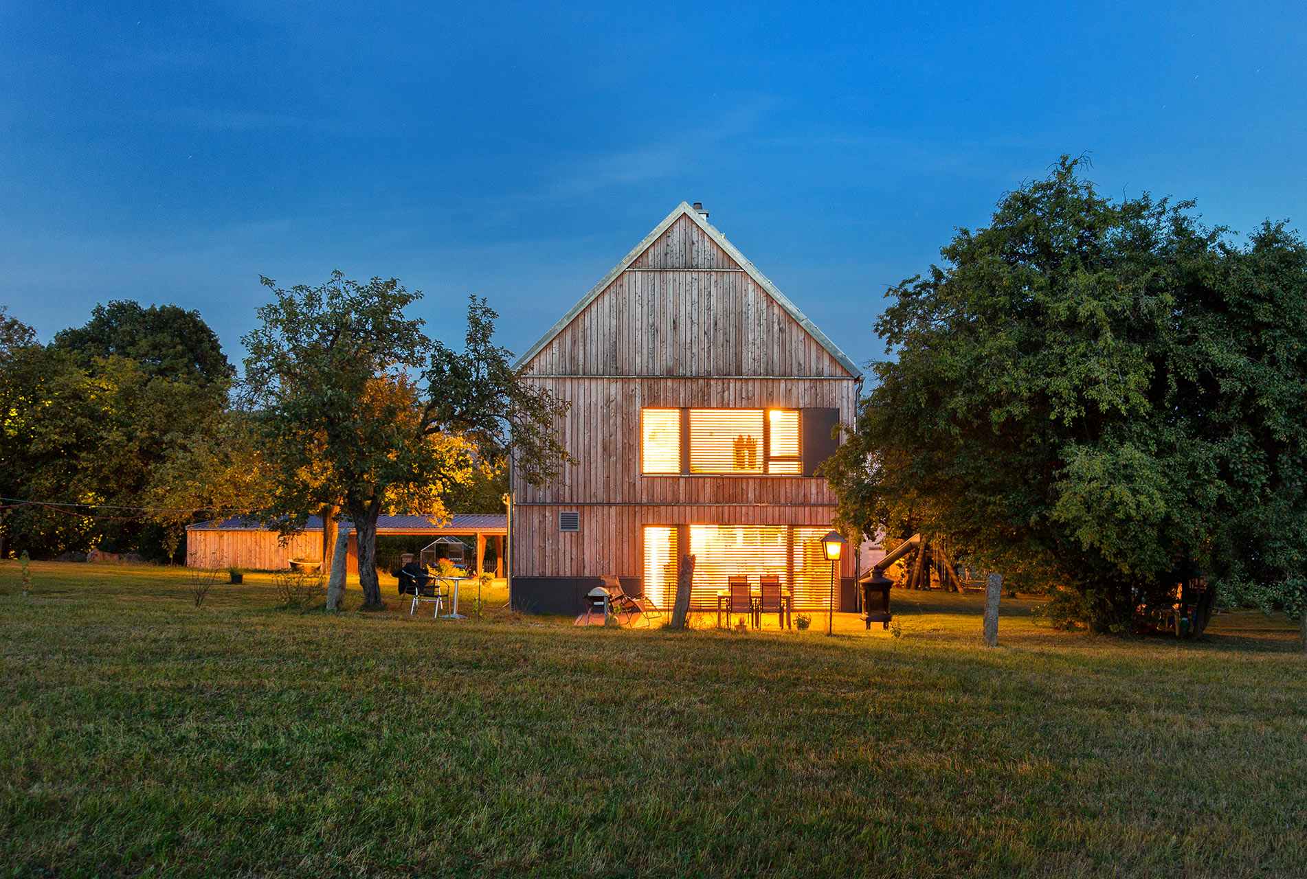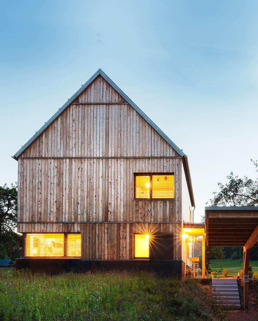 Holzhaus (KfW 55) mit senkrechter, unbehandelter Fichten-Lattung. Das spitze Satteldach fügt sich unaufdringlich ins Ortsbild ein. Mit einem geringen Dachüberstand entsteht eine Anlehnung an die Gesims-Ausführung im Oberpfälzer Baustil. Das Resultat ist ein Natur-Ensemble: im Süden der alte Bauernhof, die über 100 Jahre alte Landwirtschaft, im Norden eine Obstbaumwiese, und im Westen Äcker und Felder. Für eine zukunftsorientierte Bauweise sorgen ein Kompaktgerät als Heiz- und Lüftungszentrale sowie ausreichend Büro- und Lagerflächen im Dachgeschoss. Das offene Treppenhaus dient als vertikale Verbindung zwischen den Geschossen mit großem Nordfenster zur Obstbaumwiese. Innen mit Sichtbalkendecken über dem Erdgeschoss wird auch hier die modern interpretierte regionale Idee perfekt aufgegriffen. Zur Straße ist ein Carport mit Abstellraum im Splitlevel-Stil untergeordnet vorgelagert.