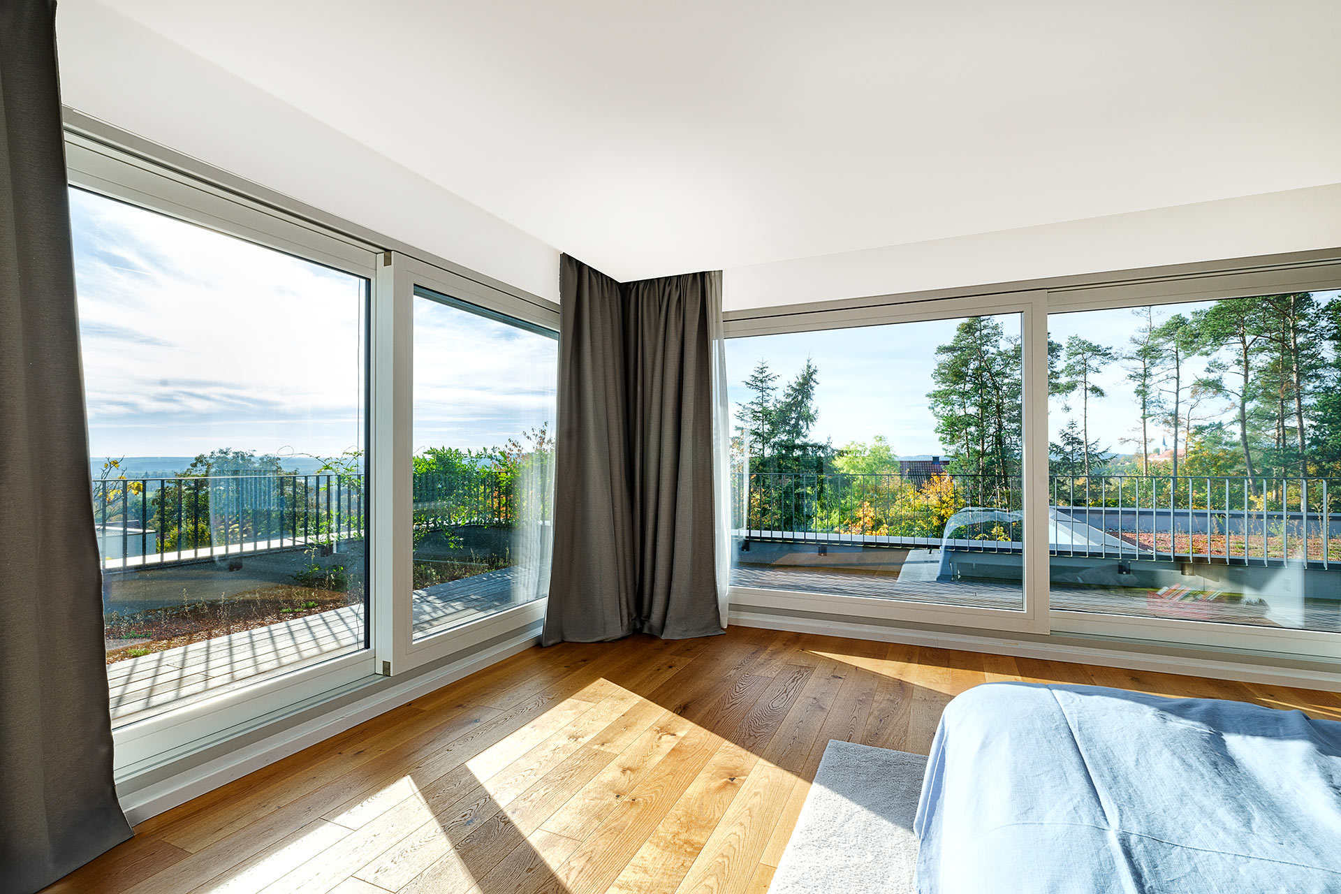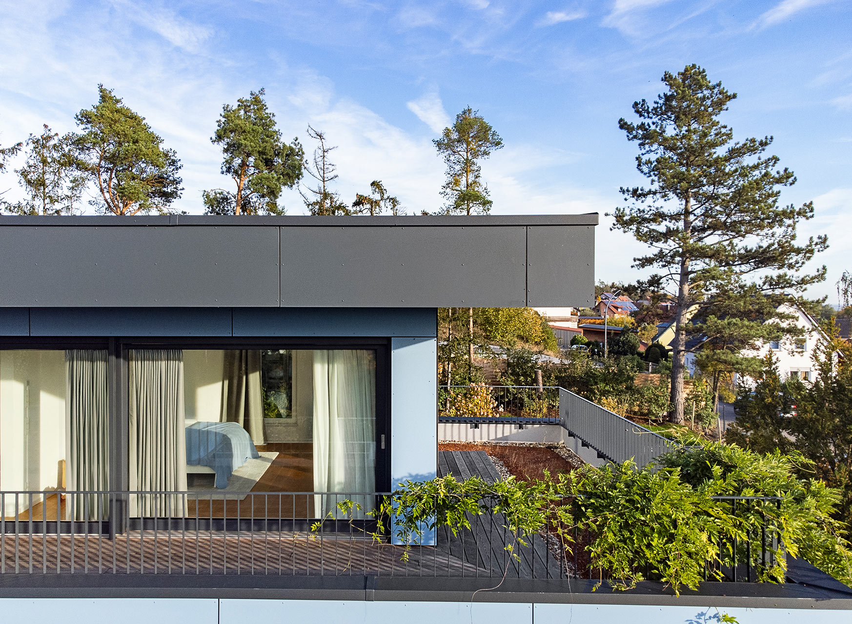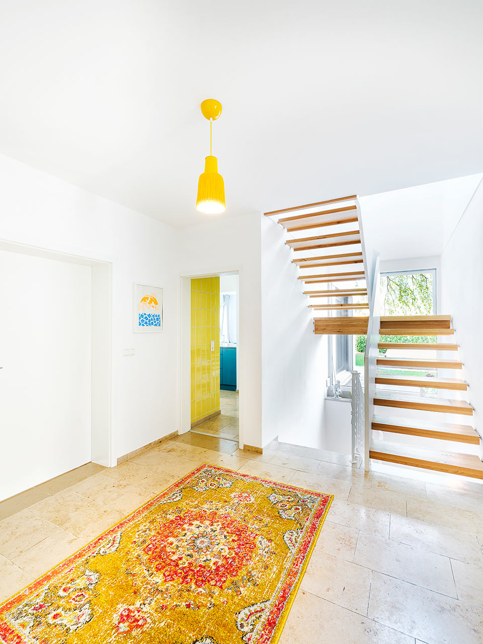 Bei dieser Aufstockung ist das Bestandsgebäude ein Bungalow in Massivbauweise. Die Materialität der Fassade im EG fand in damaligen Zeiten durch regional angesiedelte Unternehmen ihren Ursprung. Dies sollte unbedingt so bleiben. Eingebettet in wunderschöne Natur mit einem atemberaubendem Ausblick entstand durch die Aufstockung in Holzbauweise ein leicht verschachtelter, kubischer Baukörper. Fassadenplatten in wechselnden Farben bilden einen Kontrast zur Bestandsfassade und wissen dennoch mit ihr geschickt zu harmonieren. Auskragende Vordächer prägen die Gebäudeform und bilden zugleich einen natürlichen Regen- und Sonnenschutz. Dies wiederum ist dienlich bei großen Fensterfronten. Die Grundrisse sind modern und offen gehalten. Der Bauherrin war es wichtig, den Spirit des Hauses zu bewahren. Und so war es natürlich klar, dass auch die gelben Original-Fliesen in der Küche genau da bleiben, wo sie ursprünglich schon waren. Die Möblierung unterstreicht das Mid-Century-Flair, welches das ganze Haus umgibt.