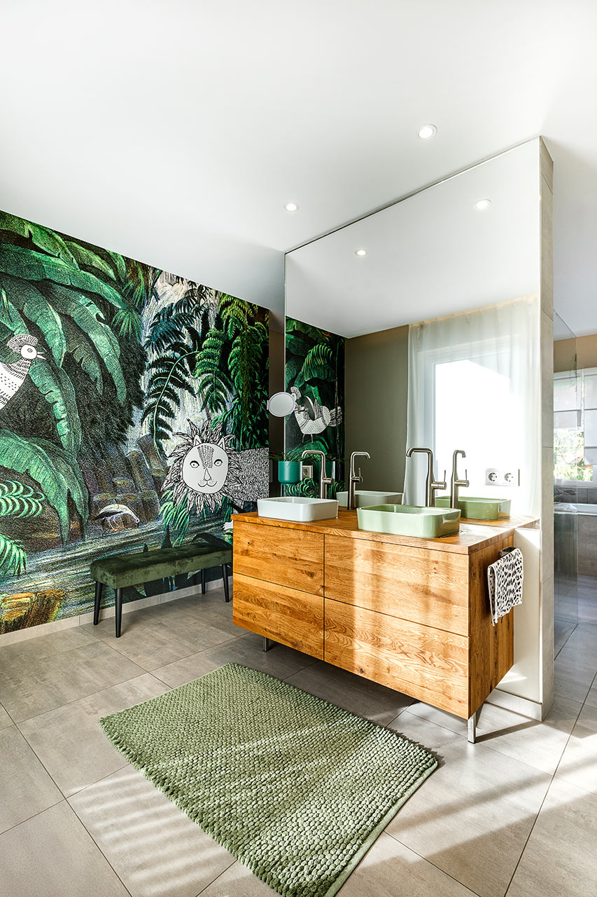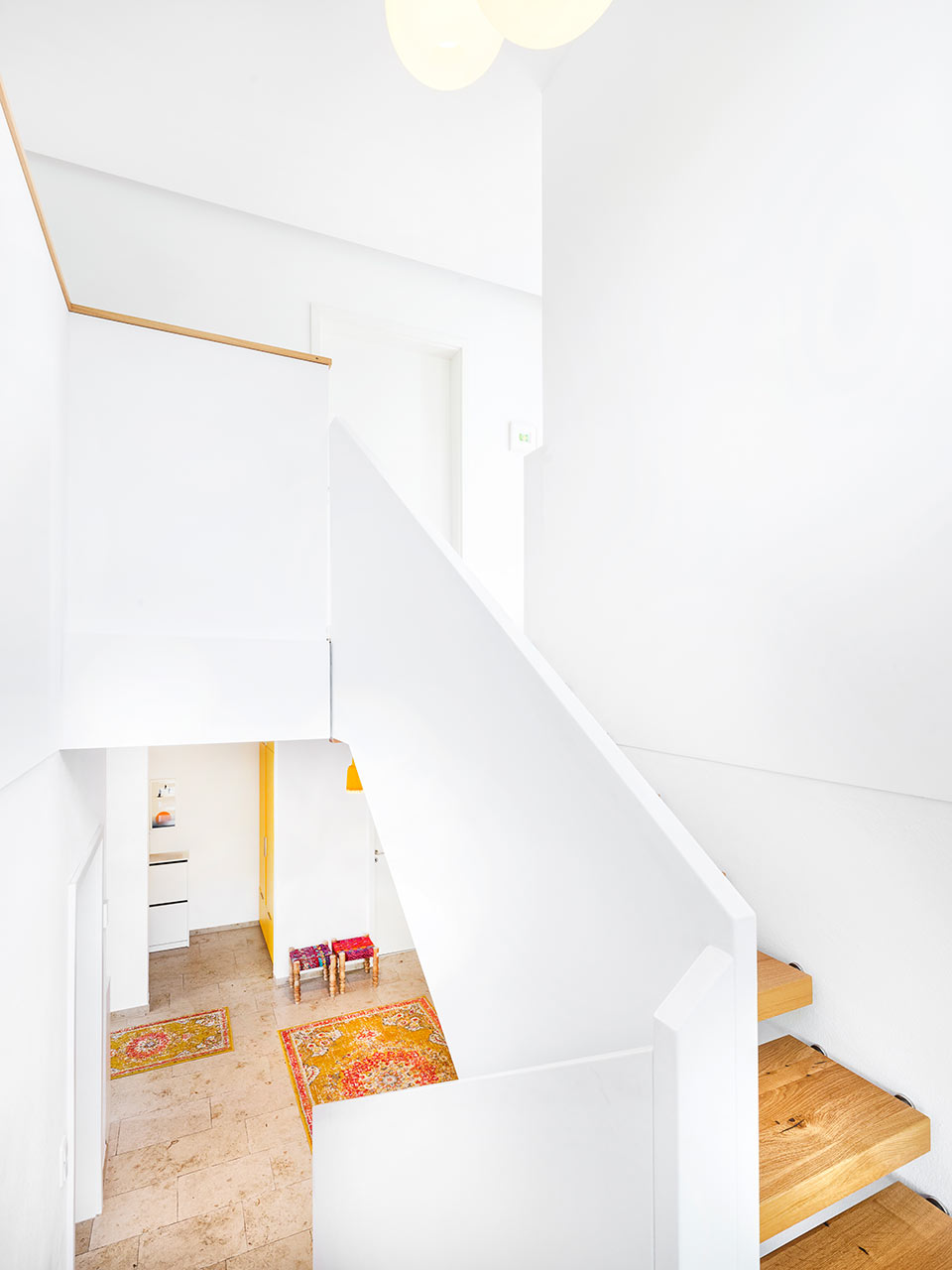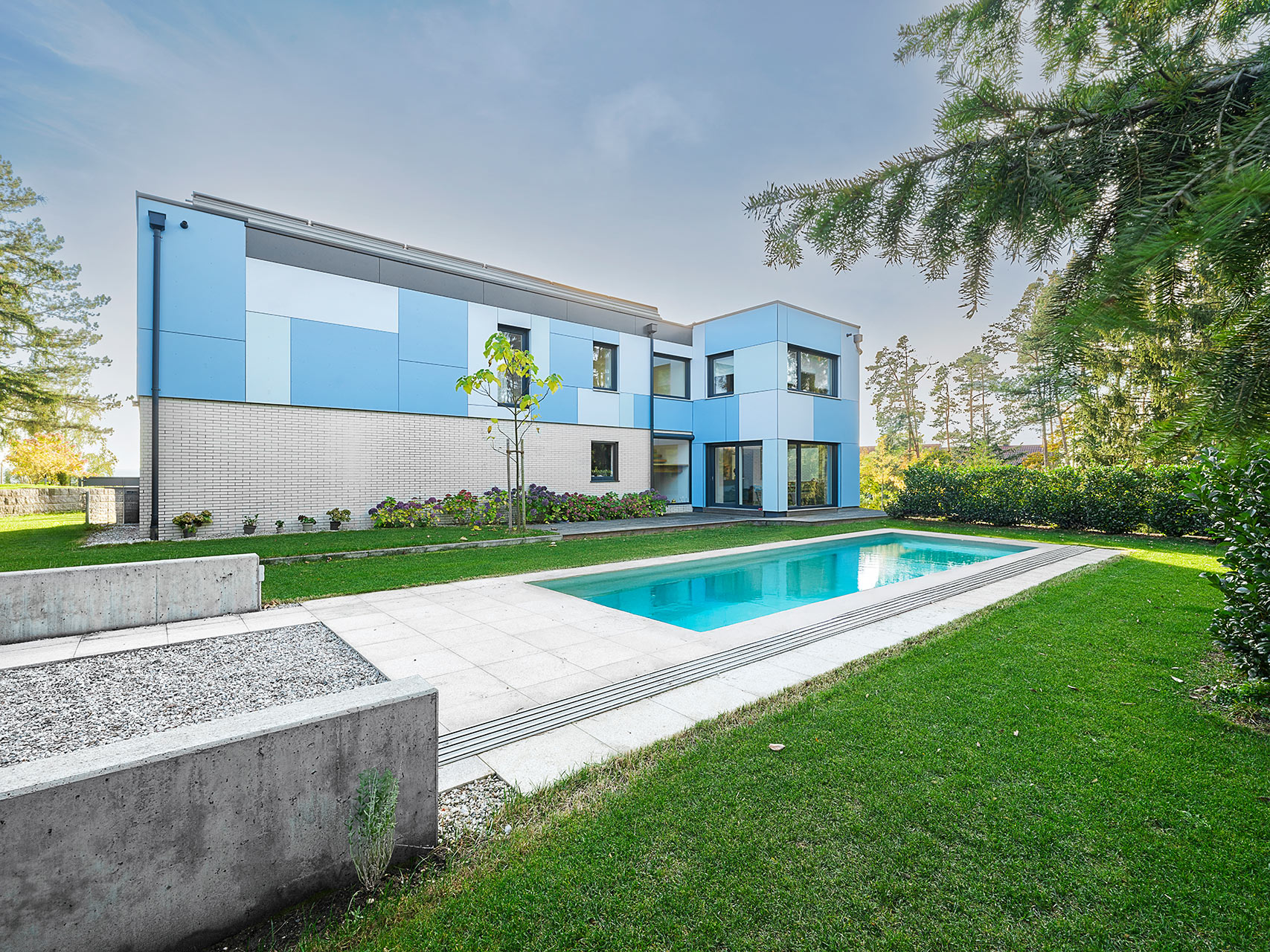 Bei dieser Aufstockung ist das Bestandsgebäude ein Bungalow in Massivbauweise. Die Materialität der Fassade im EG fand in damaligen Zeiten durch regional angesiedelte Unternehmen ihren Ursprung. Dies sollte unbedingt so bleiben. Eingebettet in wunderschöne Natur mit einem atemberaubendem Ausblick entstand durch die Aufstockung in Holzbauweise ein leicht verschachtelter, kubischer Baukörper. Fassadenplatten in wechselnden Farben bilden einen Kontrast zur Bestandsfassade und wissen dennoch mit ihr geschickt zu harmonieren. Auskragende Vordächer prägen die Gebäudeform und bilden zugleich einen natürlichen Regen- und Sonnenschutz. Dies wiederum ist dienlich bei großen Fensterfronten. Die Grundrisse sind modern und offen gehalten. Der Bauherrin war es wichtig, den Spirit des Hauses zu bewahren. Und so war es natürlich klar, dass auch die gelben Original-Fliesen in der Küche genau da bleiben, wo sie ursprünglich schon waren. Die Möblierung unterstreicht das Mid-Century-Flair, welches das ganze Haus umgibt.